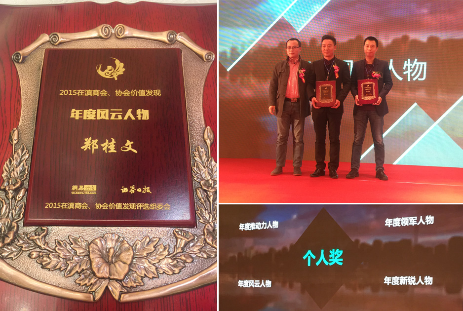 在“2015年在滇商會(huì)協(xié)會(huì)價(jià)值發(fā)現(xiàn)”活動(dòng)中,經(jīng)過在滇40余家商會(huì)、協(xié)會(huì)及專家組的評(píng)選,云南天度集團(tuán)董事長鄭桂文榮獲“年度風(fēng)云人物”稱號(hào)。
