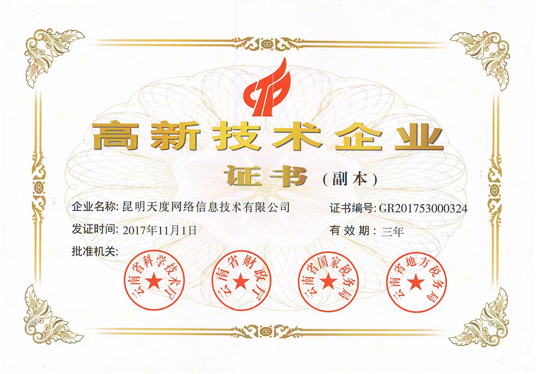 云南天度集團(tuán)旗下云南蔚嵐信息技術(shù)有限公司、云南天度科技股份有限公司、云南天度軟件系統(tǒng)有限公司、昆明天度網(wǎng)絡(luò)信息技術(shù)有限公司、重慶天度網(wǎng)絡(luò)信息技術(shù)有限公司等5家企業(yè)獲得國家高新技術(shù)企業(yè)認(rèn)定。