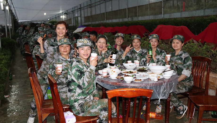 下午訓(xùn)練結(jié)束集合的時(shí)候,教官突然宣布說晚上有聚餐,大家頓時(shí)像炸開鍋一樣的,畢竟我們這兩天吃盒飯吃得眼睛都要冒綠光了,能在這么艱苦的時(shí)候有一桌大肉吃,真的讓大家有一種撿到錢的幸福感。晚餐的氣氛異常活躍,行政部妹紙們也貼心地給大家準(zhǔn)備了酒水助興。