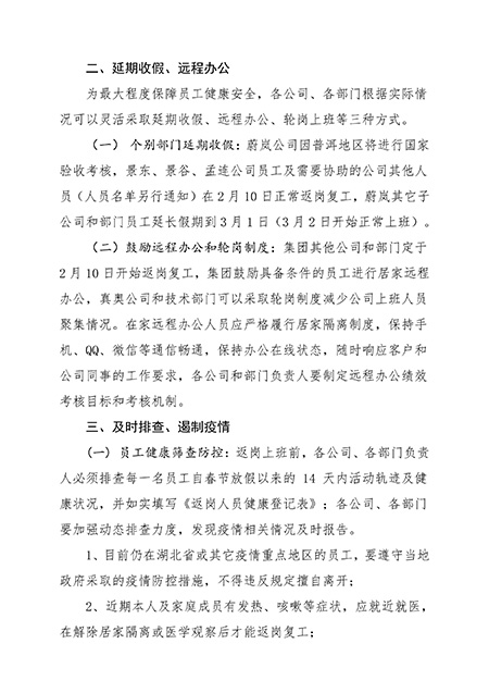 疫情就是命令,防控就是責(zé)任。為貫徹落實(shí)黨中央、國務(wù)院決策部署,按照省、市、區(qū)黨委和政府有關(guān)工作要求,切實(shí)做好新型冠狀病毒感染的肺炎疫情防控工作,保障員工生命安全和身體健康,集團(tuán)成立新型冠狀病毒感染肺炎疫情防控工作領(lǐng)導(dǎo)小組,并就做好新冠肺炎疫情防控期間員工返崗上班有關(guān)事項(xiàng)作出通知: