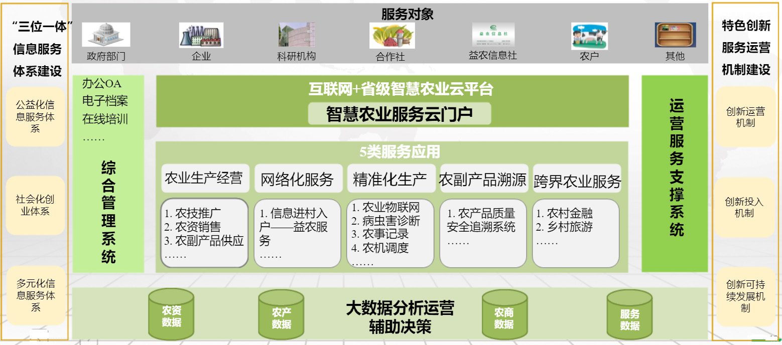 以農(nóng)業(yè)資源為基礎(chǔ)、市場為導(dǎo)向、效益為中心、產(chǎn)業(yè)化為抓手,面向農(nóng)業(yè)管理部門、農(nóng)技推廣部門、農(nóng)業(yè)企業(yè)、農(nóng)業(yè)園區(qū)/基地、農(nóng)業(yè)專家、農(nóng)民等多層次用戶體系,充分利用計(jì)算機(jī)與網(wǎng)絡(luò)技術(shù)、物聯(lián)網(wǎng)技術(shù)、音視頻技術(shù)、無線通信技術(shù)、大數(shù)據(jù)技術(shù)、云計(jì)算及專家智慧與知識,集成傳感器、土壤墑情采集站、監(jiān)控視頻頭、水肥藥一體機(jī)、太陽能氣象站、太陽能捕蟲儀、太陽能電磁閥、智能手機(jī)等智能化自動(dòng)化設(shè)備,建設(shè)以農(nóng)產(chǎn)品質(zhì)量安全、農(nóng)資安全監(jiān)管、農(nóng)業(yè)區(qū)域資源為主的監(jiān)管平臺,以種植指導(dǎo)、病蟲害防治、標(biāo)準(zhǔn)化生產(chǎn)、農(nóng)業(yè)物聯(lián)網(wǎng)、農(nóng)業(yè)生產(chǎn)診斷決策為主的生產(chǎn)管理平臺,以及以農(nóng)業(yè)資訊、農(nóng)產(chǎn)品價(jià)格走勢、農(nóng)產(chǎn)品交易、營銷推廣、質(zhì)量溯源、植物醫(yī)院、農(nóng)技推廣服務(wù)、人力資源服務(wù)為主的信息服務(wù)平臺,實(shí)現(xiàn)更完備的信息化基礎(chǔ)支撐、更集中的數(shù)據(jù)資源、更深入的政府監(jiān)管、更先進(jìn)的生產(chǎn)管理、更貼心的公眾服務(wù),實(shí)現(xiàn)農(nóng)業(yè)生產(chǎn)、監(jiān)管、服務(wù)一體化支撐,以及農(nóng)業(yè)農(nóng)村全方位、全過程的信息化、智慧化管理,達(dá)到信息技術(shù)與產(chǎn)業(yè)發(fā)展的和諧提升,推動(dòng)現(xiàn)代農(nóng)業(yè)快速發(fā)展。