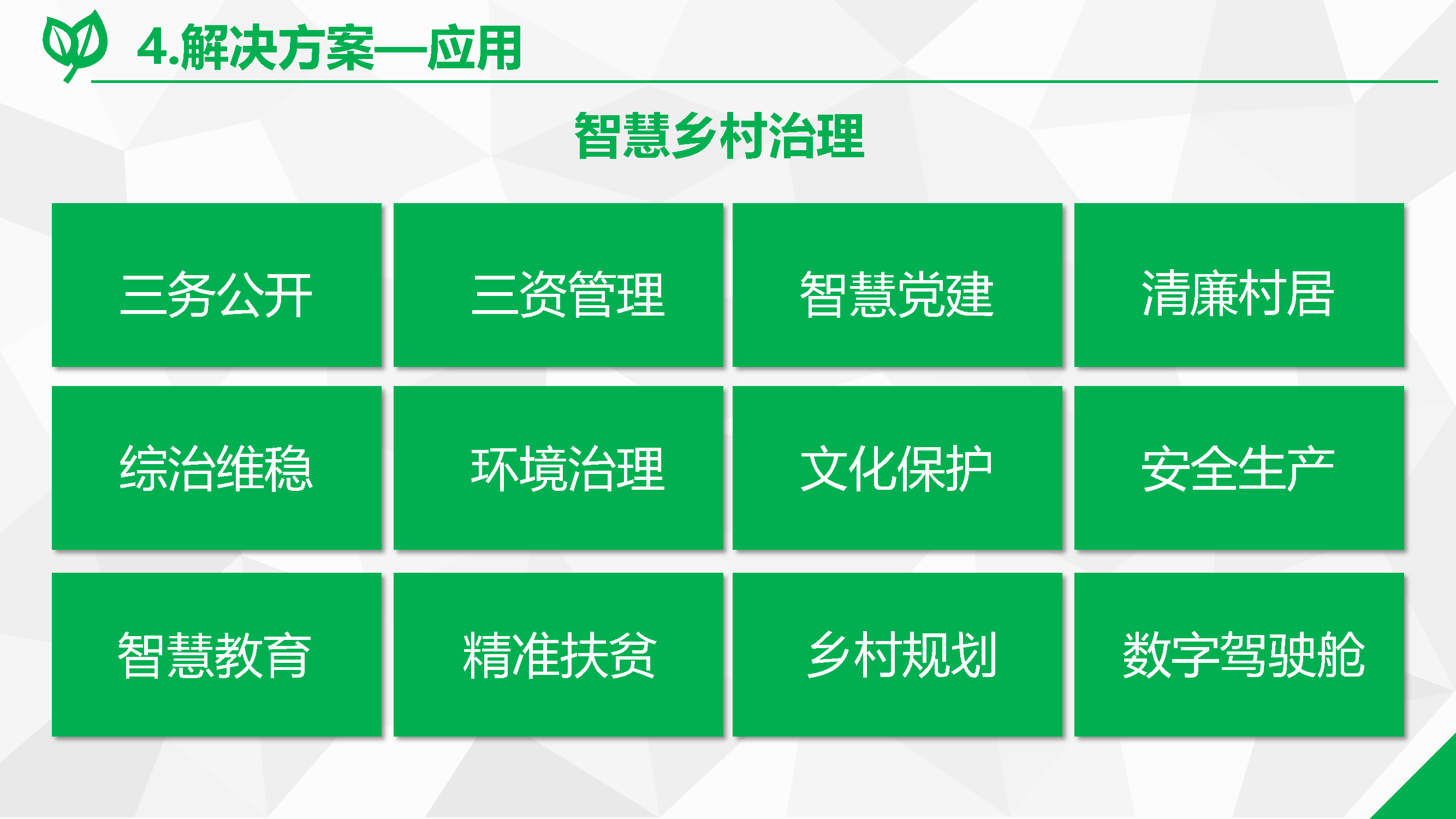 根據(jù)鄉(xiāng)村振興戰(zhàn)略的總體部署,鄉(xiāng)村治理工作應著重提升智能化、精細化與專業(yè)化水平。因此,結(jié)合自身的數(shù)字化應用開發(fā)能力,聚焦智慧黨建、村鎮(zhèn)環(huán)境保護,以及城鎮(zhèn)綜合行政執(zhí)法工作的數(shù)字化,為縣域建立健全數(shù)字治理新模式提供支撐。