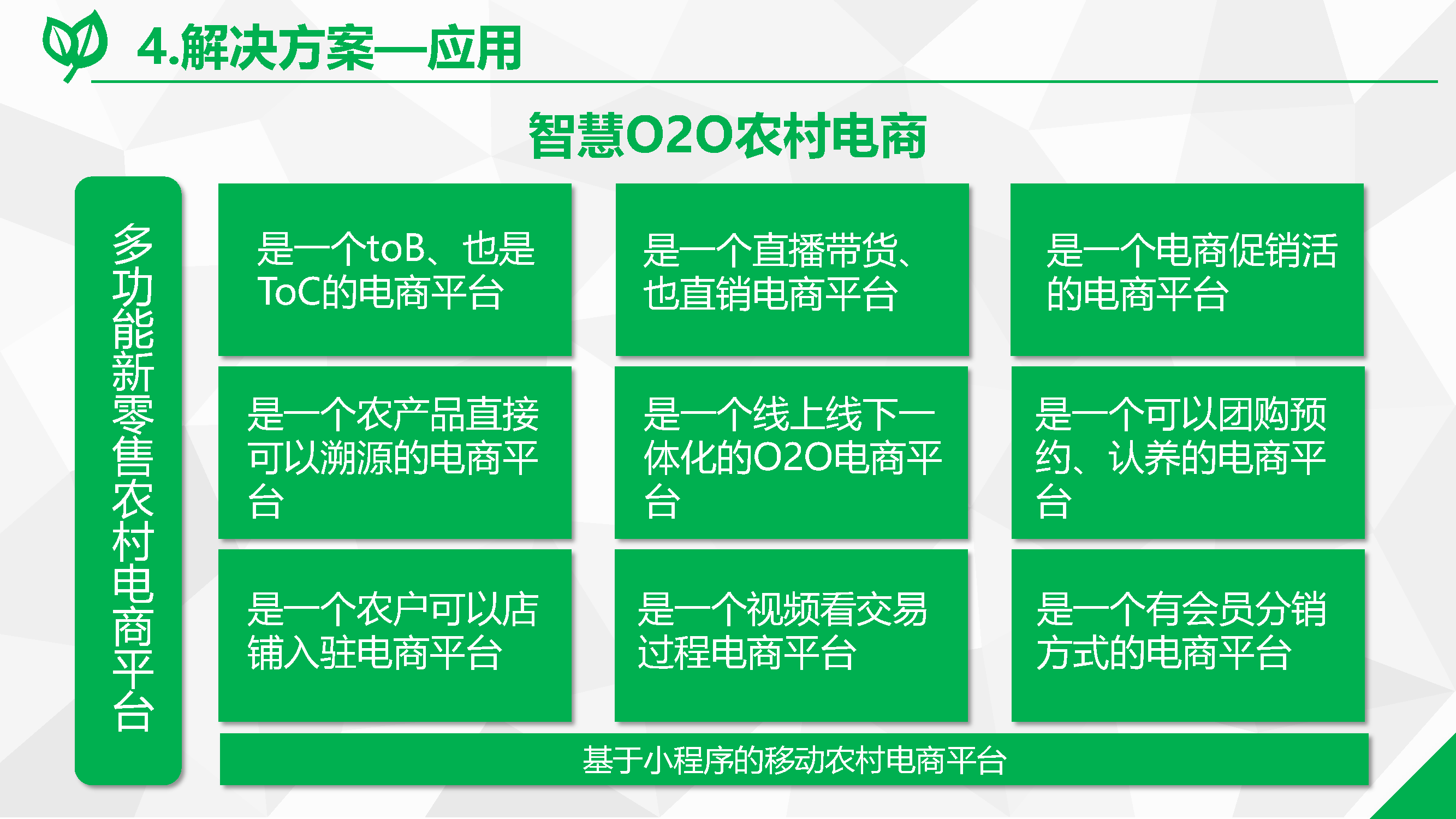 2、特色產(chǎn)業(yè)電商規(guī)劃:規(guī)劃內(nèi)容包括產(chǎn)業(yè)主體調(diào)研、核心產(chǎn)品調(diào)研和產(chǎn)業(yè)診斷及規(guī)劃。根據(jù)調(diào)研情況,依托全網(wǎng)線上多平臺沉淀的交易和用戶特征數(shù)據(jù),建立縣域產(chǎn)業(yè)發(fā)展數(shù)據(jù)模型,輸出相關(guān)分析結(jié)論,提出對縣域電子商務(wù)產(chǎn)業(yè)發(fā)展的具體建議和行動實施方案。明確縣域電子商務(wù)發(fā)展的定位、理清總體發(fā)展思路,確定分階段發(fā)展目標,能夠聚焦重要任務(wù),給出指導意見和實施建議,為政府制定縣域電商發(fā)展戰(zhàn)略,針對縣域電子商務(wù)建設(shè)提出行動綱領(lǐng),實現(xiàn)縣域經(jīng)濟的轉(zhuǎn)型升級提供決策參考。
