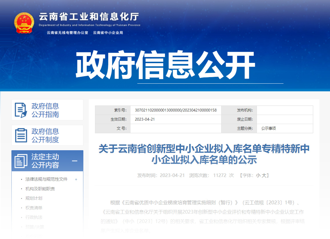 根據(jù)《云南省優(yōu)質(zhì)中小企業(yè)梯度培育管理實施細(xì)則(暫行)》(云工信規(guī)〔2023〕1號)、《云南省工業(yè)和信息化廳關(guān)于組織開展2023年創(chuàng)新型中小企業(yè)評價和專精特新中小企業(yè)認(rèn)定工作的通知》(中小〔2023〕12號)的相關(guān)要求,經(jīng)省工業(yè)和信息化廳組織相關(guān)專家復(fù)核,天度集團旗下云南天度軟件系統(tǒng)有限公司入選2023年云南省專精特新中小企業(yè)、云南省創(chuàng)新型中小企業(yè)名單;云南蔚嵐信息技術(shù)有限公司入選2023年云南省創(chuàng)新型中小企業(yè)名單。